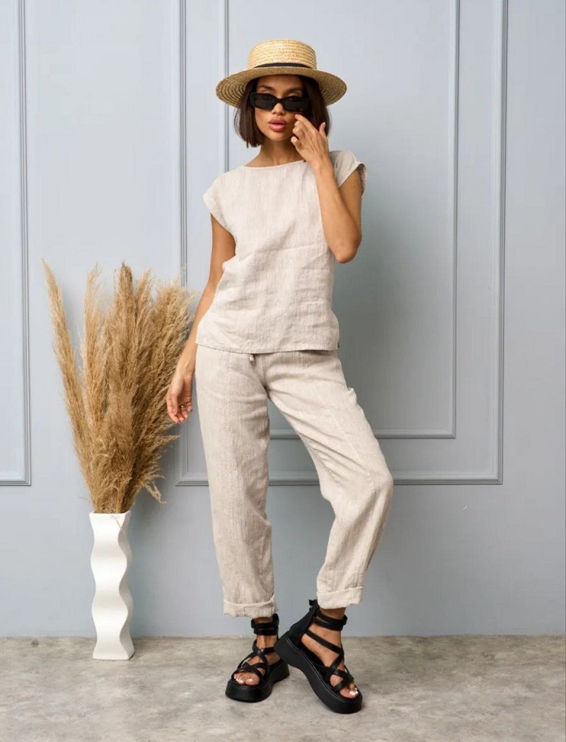 Костюм льняной ANNAMAX - это идеальный выбор для современных женщин, ценящих комфорт и стиль. Сшит из 100% льна, он обеспечивает превосходную вентиляцию и обладает антибактериальными и гипоаллергенными свойствами, что делает его комфортным даже в жаркую погоду. Модель брючного костюма из натуральной ткани с широкими брюками и топом без рукавов.