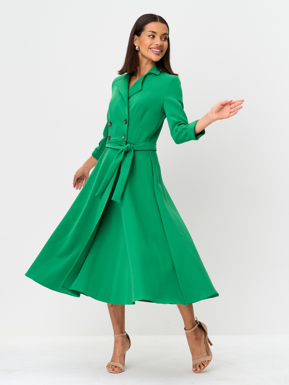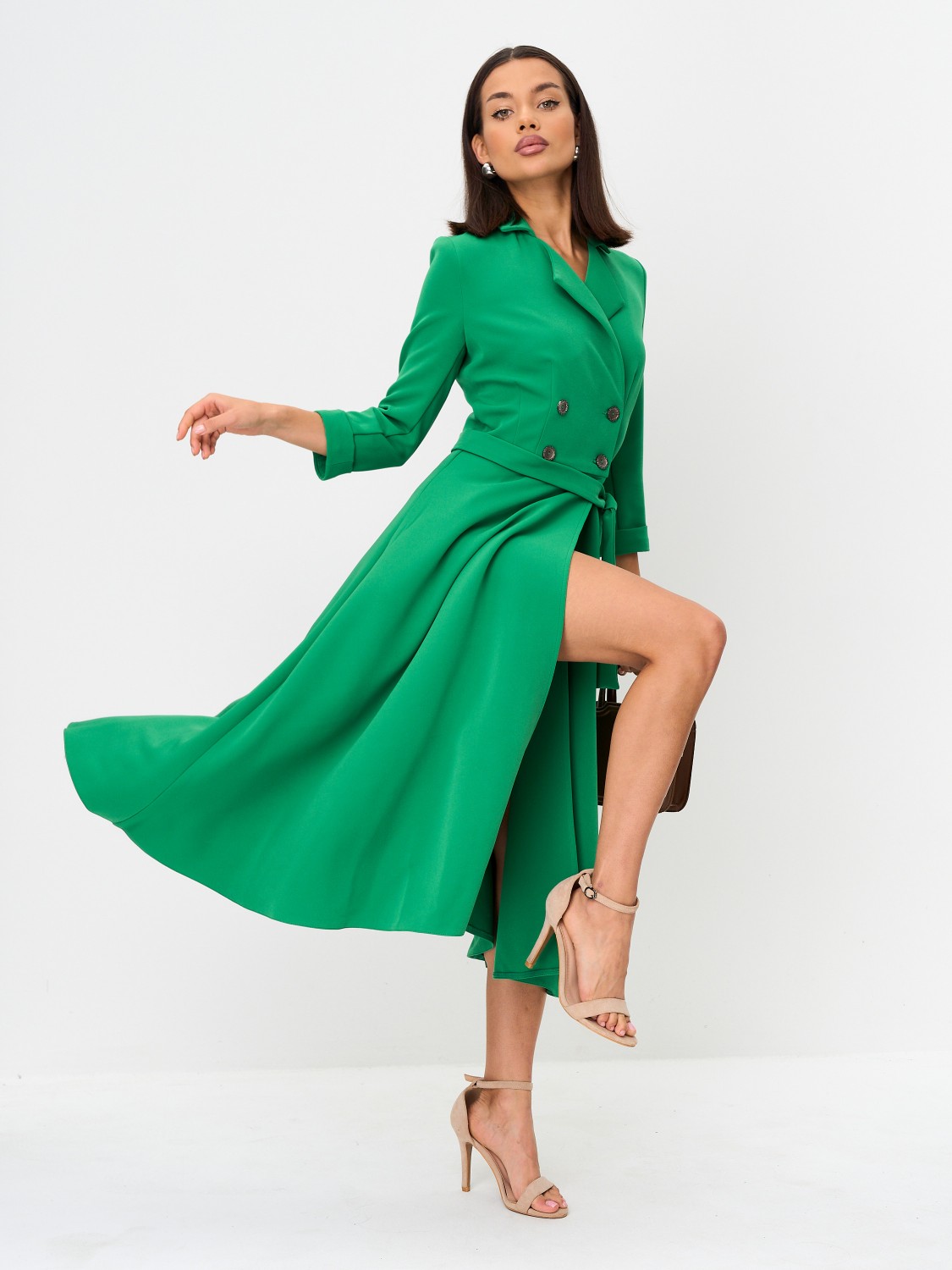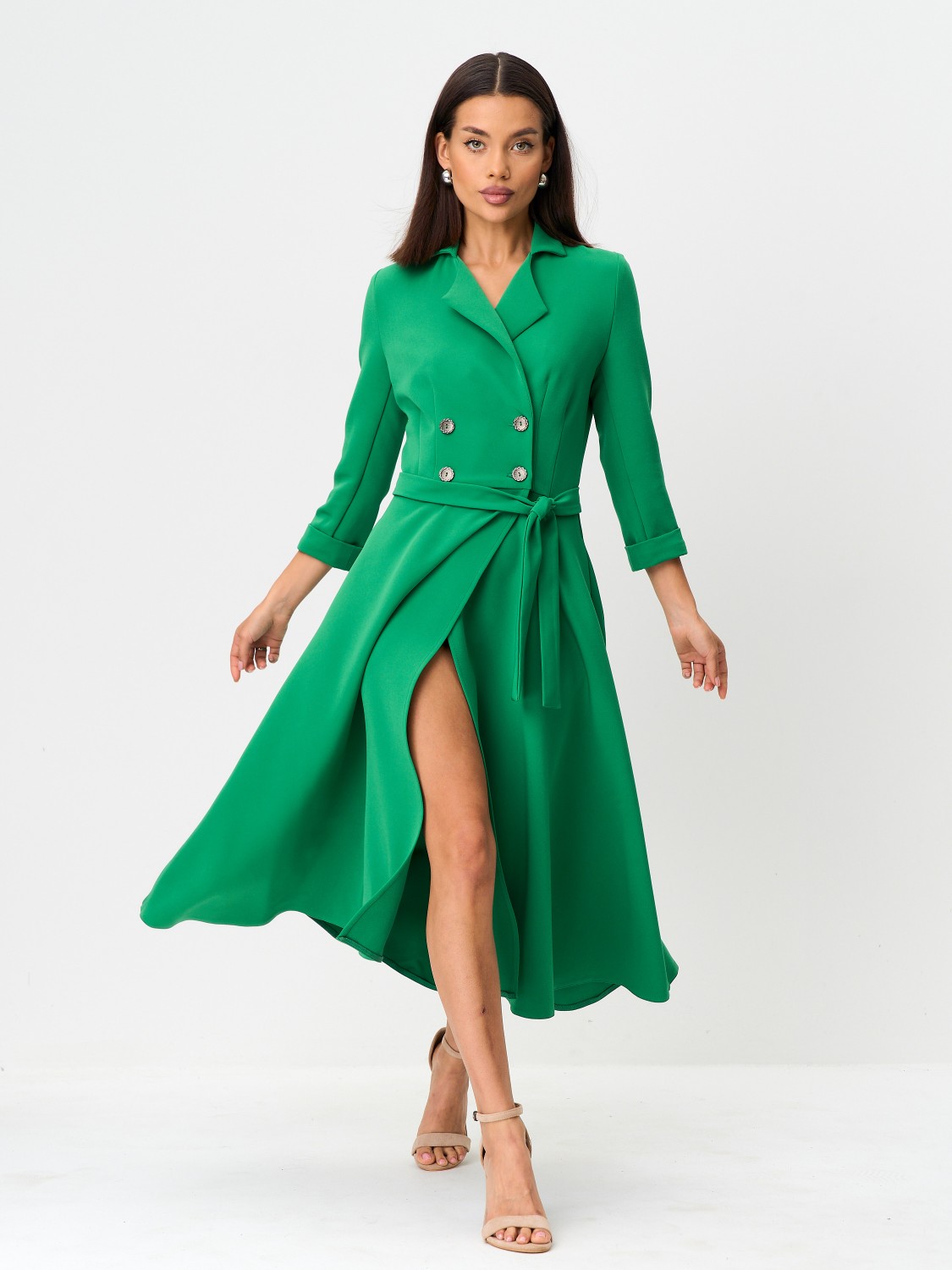 Стильное платье - пиджак миди с двубортным кроем и поясом — идеальное решение для тех, кто ценит элегантность и комфорт. Платье офисное универсального фасона на запах с отложным воротником и длинными рукавами подчёркивает фигуру, визуально стройнит и подходит для любого типа телосложения. Плотная ткань женского платья с добавлением эластана не просвечивает, устойчива к деформации и отлично держит форму. Высокий разрез спереди добавляет образу женственности и лёгкости в движении. Пояс на талии позволяет подчеркнуть силуэт и создать выразительный акцент. Длина миди до середины икры делает модель уместной в офисе, на деловой встрече, свадьбе в качестве гостевой одежды или вечернем выходе. Легко комбинируется с туфлями, балетками, кроссовками — подходит для создания образов в стиле smart casual, офисный шик или уличная мода. Универсальный крой и качественный крой делают это платье must-have в современном гардеробе.