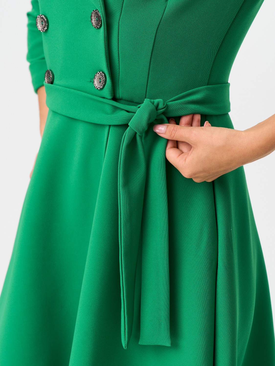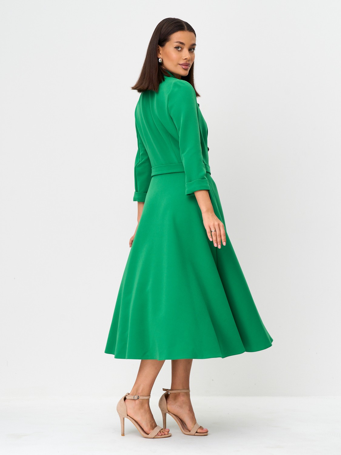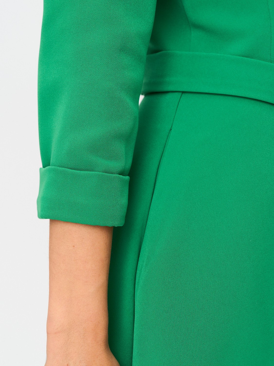 Стильное платье - пиджак миди с двубортным кроем и поясом — идеальное решение для тех, кто ценит элегантность и комфорт. Платье офисное универсального фасона на запах с отложным воротником и длинными рукавами подчёркивает фигуру, визуально стройнит и подходит для любого типа телосложения. Плотная ткань женского платья с добавлением эластана не просвечивает, устойчива к деформации и отлично держит форму. Высокий разрез спереди добавляет образу женственности и лёгкости в движении. Пояс на талии позволяет подчеркнуть силуэт и создать выразительный акцент. Длина миди до середины икры делает модель уместной в офисе, на деловой встрече, свадьбе в качестве гостевой одежды или вечернем выходе. Легко комбинируется с туфлями, балетками, кроссовками — подходит для создания образов в стиле smart casual, офисный шик или уличная мода. Универсальный крой и качественный крой делают это платье must-have в современном гардеробе.