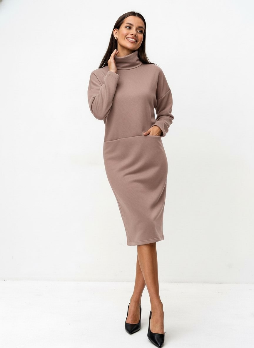 Платье из футера — это ваш новый базовый хит — для тех, кто ценит лаконичность, но не готов жертвовать стилем. Высокий воротник-стойка — не только тренд, но и элегантный акцент, который добавляет образу аристократичности. Длинные рукава создают эффект «воздушного» силуэта сверху, а юбка-карандаш — идеально подчёркивает линию бёдер и талии, не сковывая движений. Удобные карманы — не просто декор, а функциональный элемент, который делает платье ещё более практичным и современным. Красота этого платья — в его способности быть одновременно простым и глубоким, удобным и роскошным, повседневным и праздничным.
