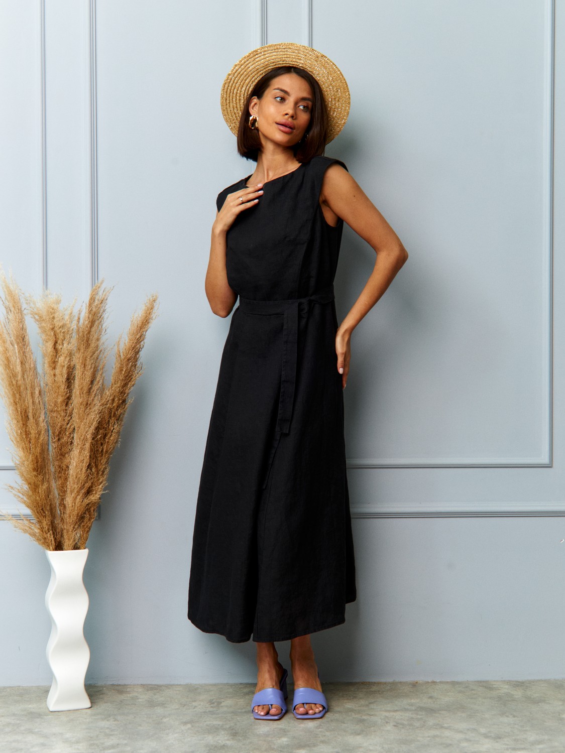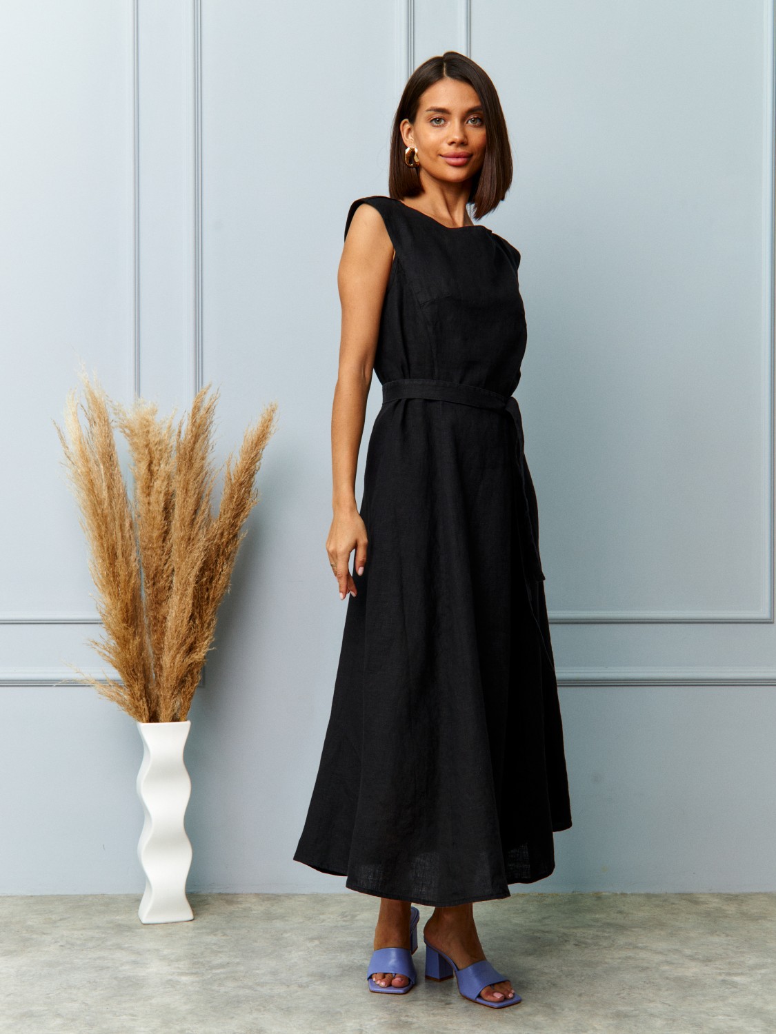 Стильное женское льняное платье черного цвета — идеальный выбор для лета. Лаконичный крой без рукавов, натуральная дышащая ткань и удобный пояс на талии подчеркивают фигуру и обеспечивают комфорт в жаркую погоду. Летнее платье из льна отлично подходит для повседневных образов, отдыха, отпуска, прогулок по городу и курортного гардероба. Универсальный фасон легко сочетается с сандалиями и минималистичными аксессуарами.