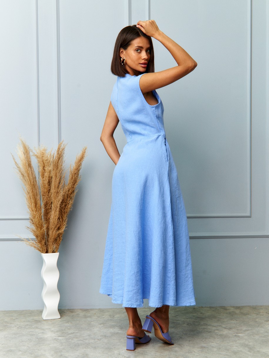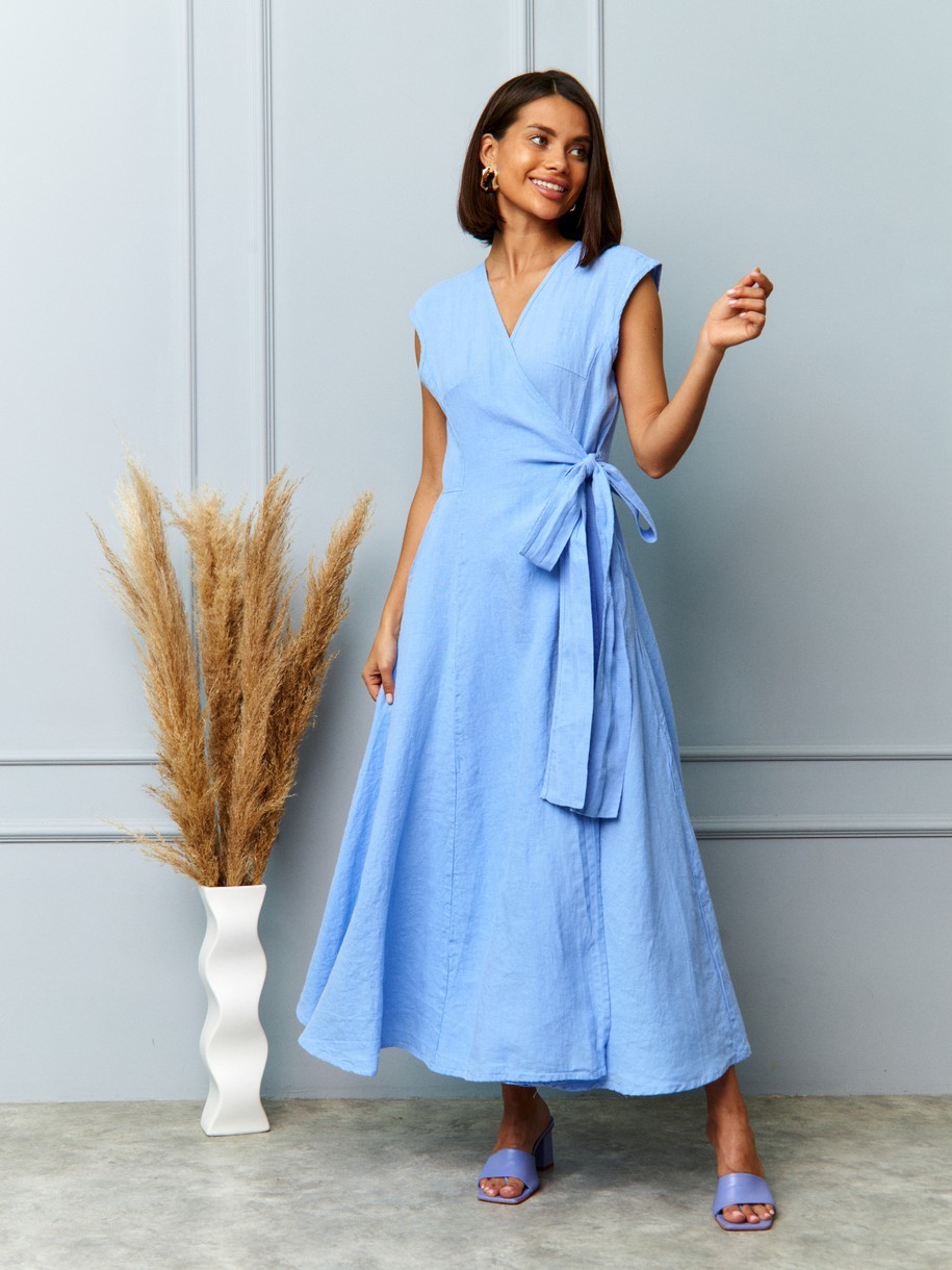Льняное платье - это идеальный вариант для любого случая, сочетающее в себе стиль и комфорт.  Крой с запахом идеально облегает фигуру, подчёркивая талию, не сковывая движений. Пояс-завязка позволяет регулировать посадку, делая каждое платье уникальным — как будто сшитым специально под вас. Высокий разрез спереди добавляет изящества и движения, а прямой или слегка расклешённый силуэт — универсальности. Материал — 100% натуральный лён — это основа комфорта и устойчивой моды. Он дышит, охлаждает тело, не вызывает раздражения и становится мягче с каждым ношением. Это ткань, которая живёт с вами, адаптируется, становится частью вашего образа.