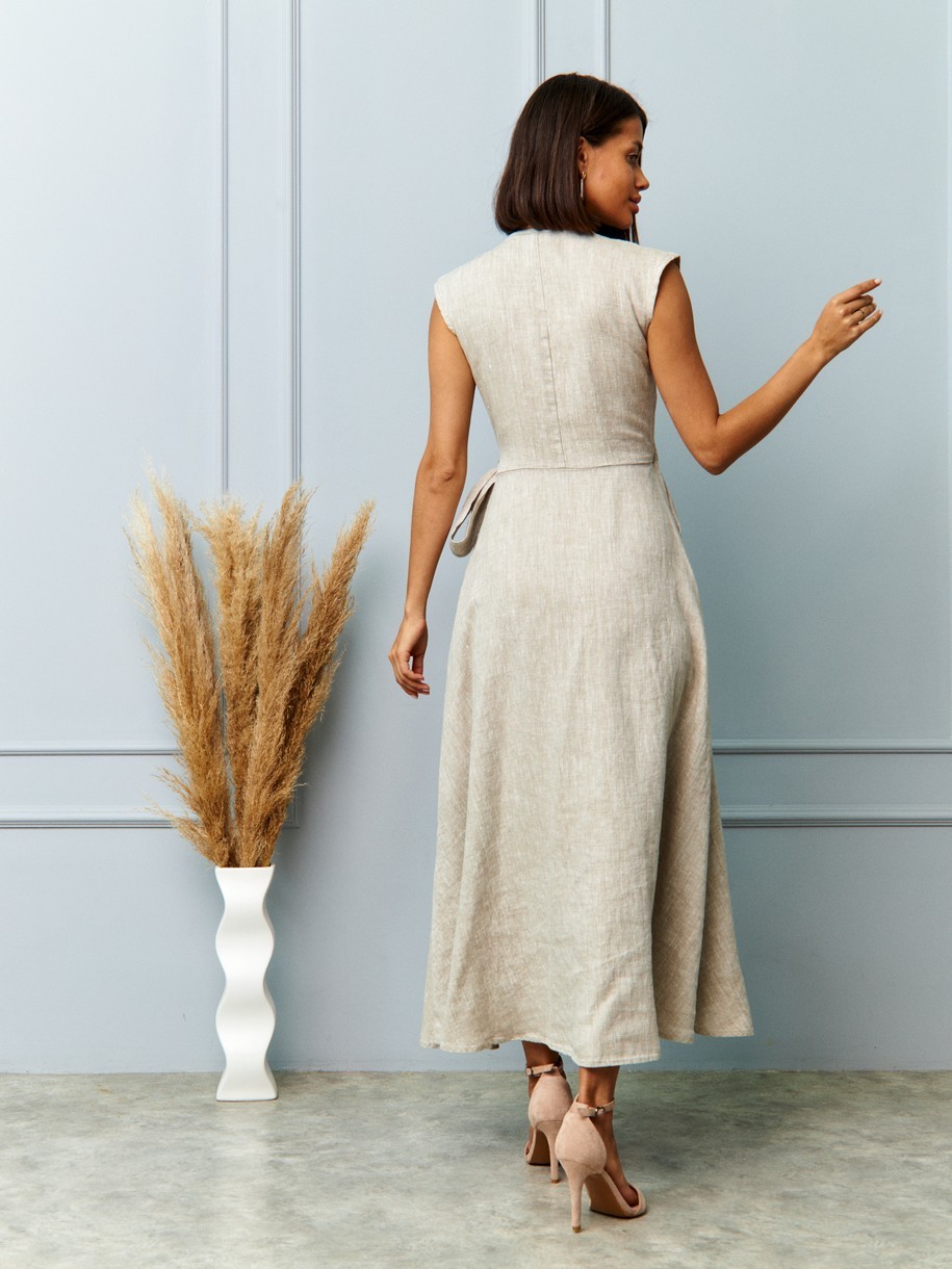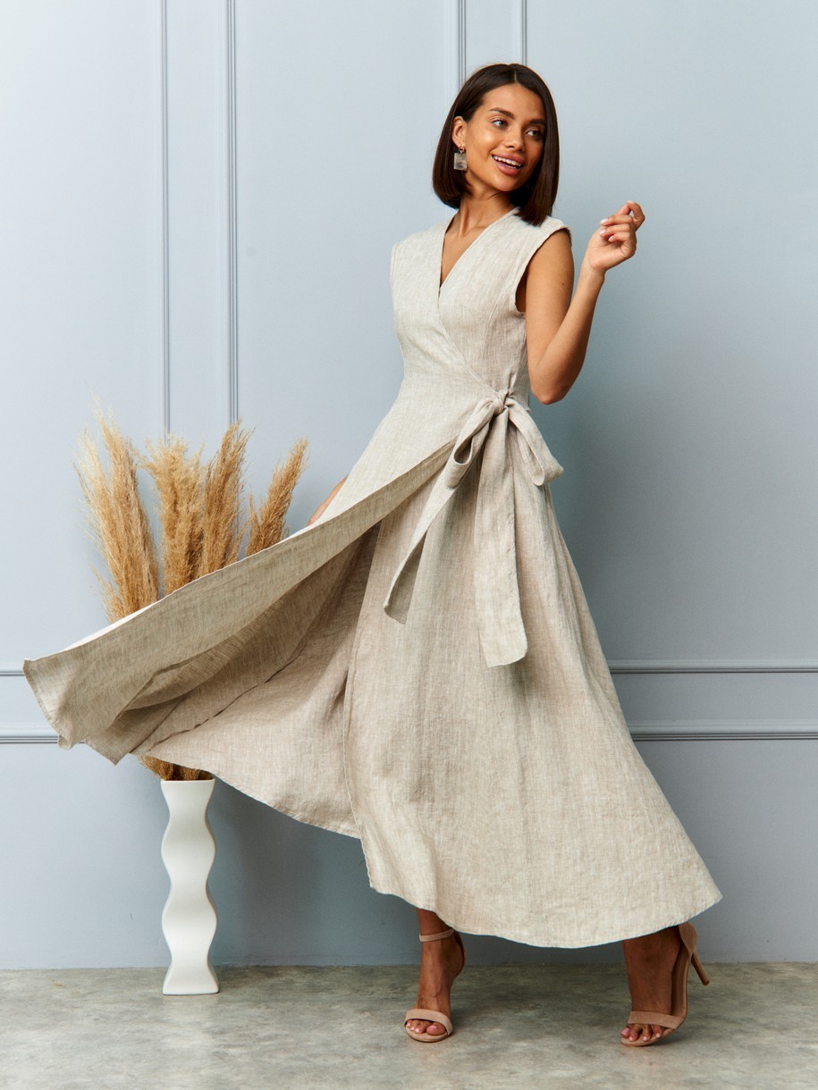 Льняное платье - это идеальный вариант для любого случая, сочетающее в себе стиль и комфорт.  Крой с запахом идеально облегает фигуру, подчёркивая талию, не сковывая движений. Пояс-завязка позволяет регулировать посадку, делая каждое платье уникальным — как будто сшитым специально под вас. Высокий разрез спереди добавляет изящества и движения, а прямой или слегка расклешённый силуэт — универсальности. Материал — 100% натуральный лён — это основа комфорта и устойчивой моды. Он дышит, охлаждает тело, не вызывает раздражения и становится мягче с каждым ношением. Это ткань, которая живёт с вами, адаптируется, становится частью вашего образа.